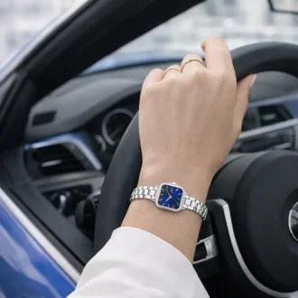 - Elegantní modrý ciferník se stylovými indexy a ručičkami zdůrazňuje jemnost a ženskost.