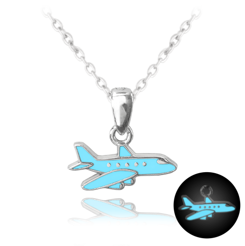 MINET Svítící modrý dětský stříbrný náhrdelník LETADLO JMAD0032AN38