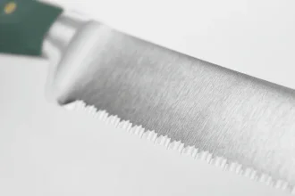 - Vroubkovaná čepel z oceli X50CrMoV15 – zajišťuje snadné a čisté krájení chleba i pečiva bez rozdrcení.